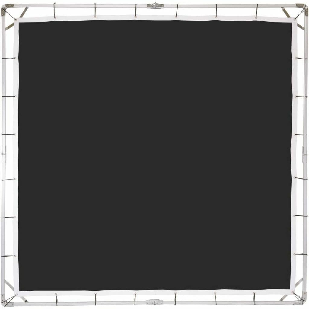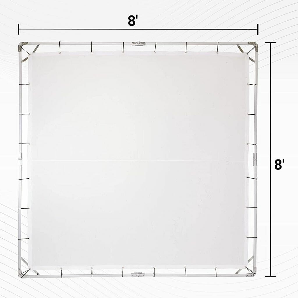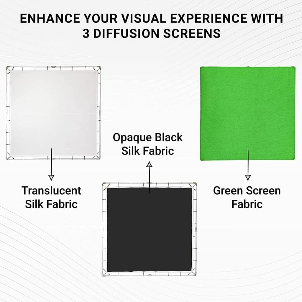 Package Includes: 1x 8×8′ Collapsible Aluminum Frame, 1x 7.6×7.6′ Translucent Screen of Artificial Silk Material, 1x 7.6×7.6′ Opaque Black Artificial Silk Material, 1x 8×8′ Green Screen Fabric, 28x Elastic Bungee Tiedown Cords, 2x Frame Adapter Brackets for C Stands, 1x Padded Carrying Case